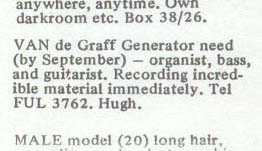 The four-piece VdGG was by now a professional outfit with a stable line-up, a manager, and a recording contract. As if. By now we're moving into the dog days of 1968. Through Strat we had an agent. Through the agent we had gigs. That's what you did, then (too right!): played live. We played all over the UK, we did Beat Club in Bremen, we supported Hendrix at the Royal Albert Hall (YES!!!). We even went back into the studio, more in hope than in true expectation of release (in both legal and record senses), I suppose and cut "Afterwards" and "Necromancer". This, then, was the group of which I wrote in the original liner notes (see over) "...the old band", I guess. But we were stuck.