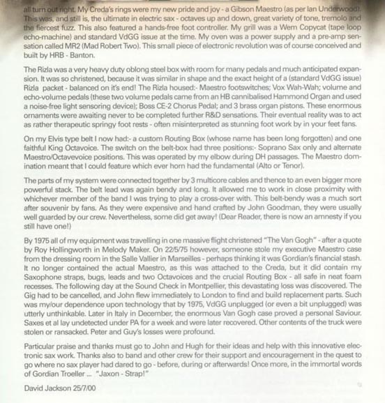 Alto, tenor, soprano and baritone saxophones, flute and whistle (all at the same time!) "And Dave Jackson must be the Van Gogh of the saxophone - a renegade impressionist, dispensing distorted visions of the world outside from his private asylum window" (from a review by Jonathan Barnett in the NME) Tim Locke interviewed Dave Jackson in May 2001.