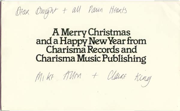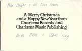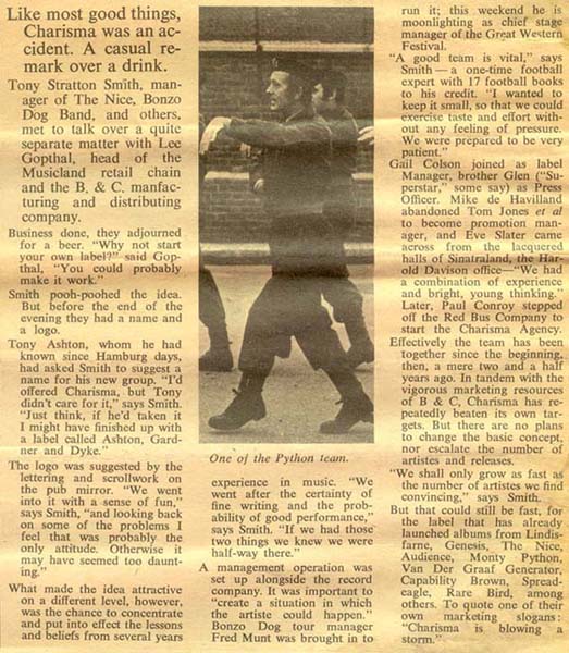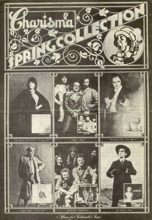 What Charisma has required of its artists is material, performance, and the ability to 'get it on' with an audience. Artists have required of Charisma a situation in which they could 'happen'. In its best aspect the thing has worked that simply, and that well. We should avoid the truancy of words such as 'taste' and 'intuition': faith and hard work would be better. Now we are four years old. A small 'boohah!' to those who thought we couldn't make it. A blessing on all those who helped Charisma make it; especially a marvellous staff. Above all, the artists. The artists on this album are the sum of an exciting beginning, the parts of an affectionate history. One day such happiness should be celebrated with a book." - Tony Stratton Smith (sleeve note) |