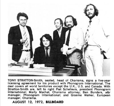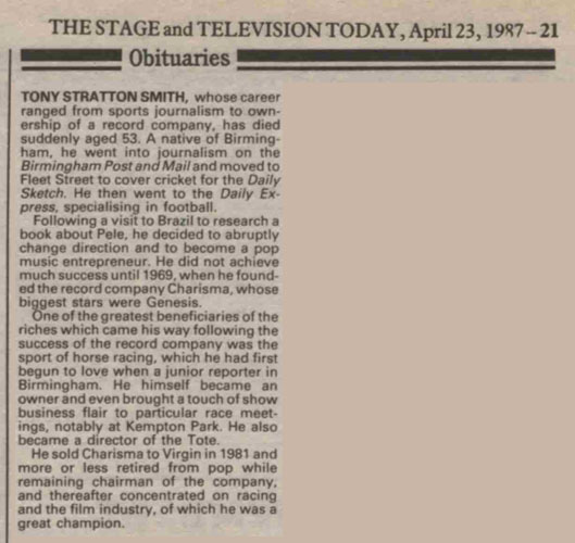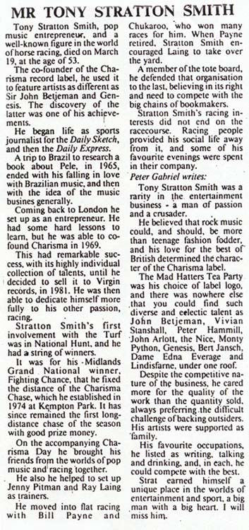 ![]() "...We live in a time when record company executives seem to be getting greyer with each passing day. Managing a label is increasingly perceived as no different from, say, managing a vacuum cleaner company. It is a situation that Tony Stratton Smith would have certainly decried before returning to consider his racing form over a glass of wine. Or 12. The man who signed Genesis was as far removed from today's business school-educated bean-counters as can be imagined. Originally a sports journalist, in 1958 he narrowly escaped losing his life in the Munich air disaster when he decided at the last minute to cover a world cup qualifying match (from that point on until his death in 1987 he would never board the flight that he was actually booked on). Inspired by a meeting with Brian Epstein, he began managing such acts as The Koobas and The Nice and established Charisma in 1968. By then his CV also included a biography of the martyr Mother Maria Skobtsova and, rumour has it, a spell with MI5. "Charisma was really a one-man show" says Glen Colson (a press officer at Charisma). "Strat signed all the bands and we just sort of ran around listening to him. He was a drinker, you see. He was out every night until five in the morning. He was hanging out with MPs, he had racehorses. He was a homosexual as well so he used to really get around. I was into Jimi Hendrix at the time so I didn't think much of Genesis. But he just said, 'I like the look of these guys, I'm going to sign them.' Strat wanted one of everything. He wanted a classical band, a jazz band, a rock band, which used to confuse the shit out of everybody that worked with him. Because you'd come in one day and he'd have signed something that you knew nothing about, like Monty Python or John Betjeman. But he just wanted to sign acts that were the best of their kind. That was always his dictum." Genesis may not have known it at the time but in Stratton Smith they had found probably the one person in the world both willing and capable of supporting their vision - regardless of the cost. "Genesis nearly bankrupted the company before they took off", says Colson. "But Strat never gave a shit what anyone else thought. You know, there were all kinds of people screaming at him day and night - to get out of bed, to stop drinking, whatever. But he did whatever he wanted." "Genesis weren't all that popular among some people in the Charisma office," says Paul Conroy, who was handed the responsibility of booking gigs for the band, "because they were seen as a bit posh and Richard was always coming in begging for money to fix up their van. But Strat adored them. He was convinced they would succeed - and after a lunchtime spent in the pub he would become even more convinced. And he was prepared to put his money where his mouth was." Colson:"They were very polite people. They all sounded like Prince Charles. They'd say, 'One does this, one does that. One buys first editions here. Blah-de-blah.' I guess Genesis would have been a couple of hundred thousand pounds in debt when they actually broke. And he would have literally spent treble that to make them. He had a bee in his bonnet about it. He was the only bloke who ever believed in them." "It was a nice label," says Mike Rutherford. "Full of new bands - Van der Graaf Generator, us, Lindisfarne, The Nice. We were on £10 a week each for the first year, I think. But the main thing was that they supported us - suddenly we became their problem." Genesis would repay that commitment by sticking with the label until Stratton Smith sold it to Virgin in the early '80s. "Strat was a really important part of our life," says Rutherford. "You'd always come away from a meeting with him feeling that there was hope after all. He was very much a good viber, which we needed at the time we signed." ..." - Clark Collis (from an article about Genesis in Mojo magazine, March 2001) | ||||