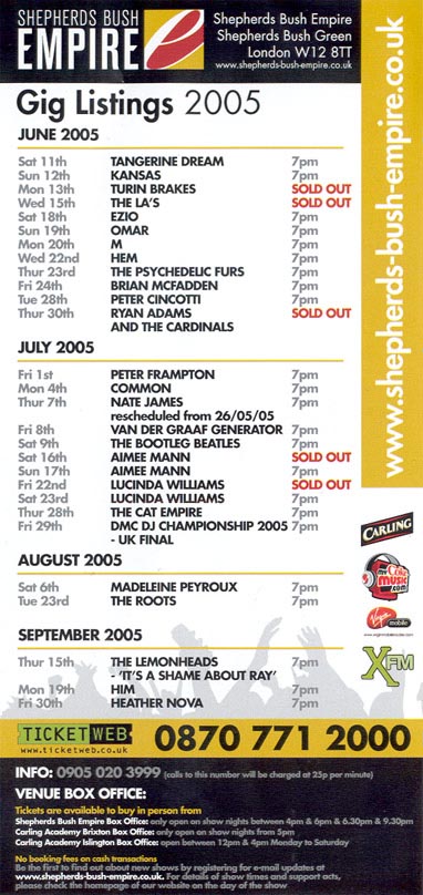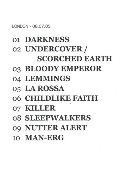 "The gig... when the band came on stage, PH called for a minute's silence in rememberance of the victims of the terrorist attacks the day before. Darkness kicked off - phenomenal version. In fact the whole set was great - fantastic atmosphere - lots of singing along in the mosh pit, a bit of tango-ing (guilty!). Loads of good improvisation, in Killer especially. A few wheels falling off lyrically from PH but this didn't detract from the enjoyable-ness of the gig. Childlike Faith was particularly worthy of note. Bit disappointed with La Rossa... a bit under-rehearsed to my mind. Man-erg also a stonking version. Encores were Refugees - a bit shouty a la