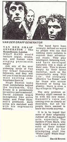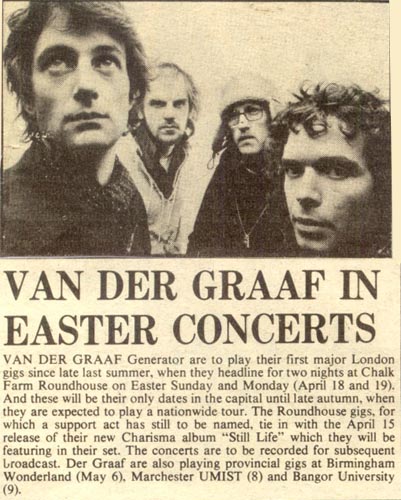 11th October 1975; University of East Anglia, Norwich, England (Godbluff tour). Diary comment: "VdGG were brilliant - it was all a bit much for me - it was the best weekend I've had for years". |