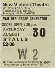21st November 1976; Theatre Royal, Drury Lane, London (World Record tour). Went with Twinx, Bob, Ian, and possibly Richard. I don't really remember this gig but Ian enjoys recounting the story of how I tried to convince them that the band wouldn't do an encore. Having not seen VdGG before (I had dragged them along) they stayed put but I was half way out the door when they reappeared! The encore was supposedly "When She Comes" but strangely this is missing from the private recording of the concert. The setlist was: Masks La Rossa Still Life A Place to Survive Lemmimgs Arrow Childlike Faith in Childhood's End Meurglys III Gog Sleepwalkers (When She Comes)?? |