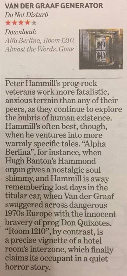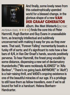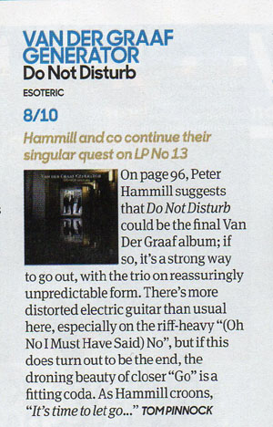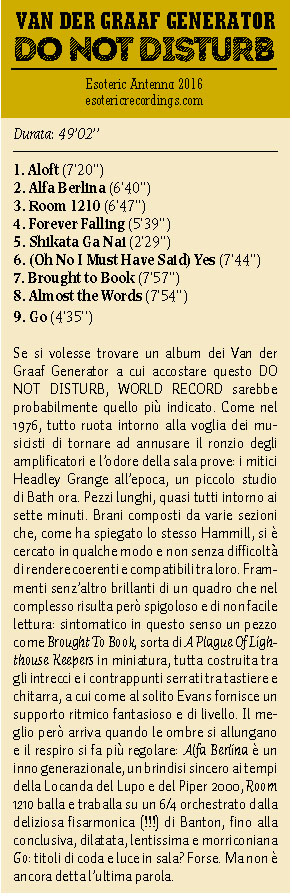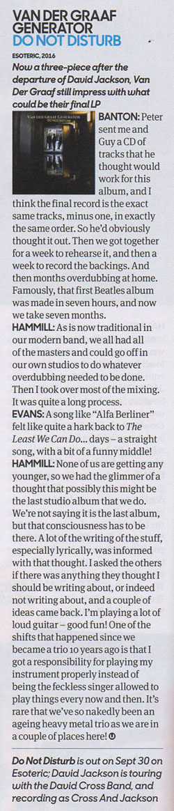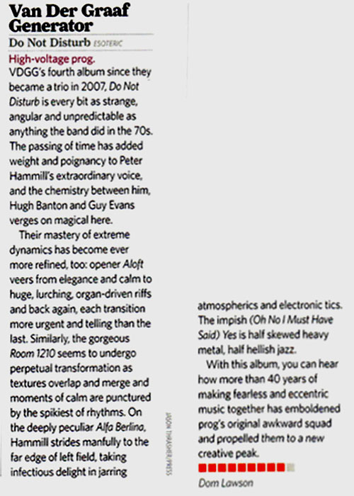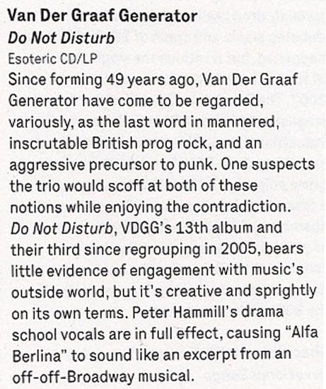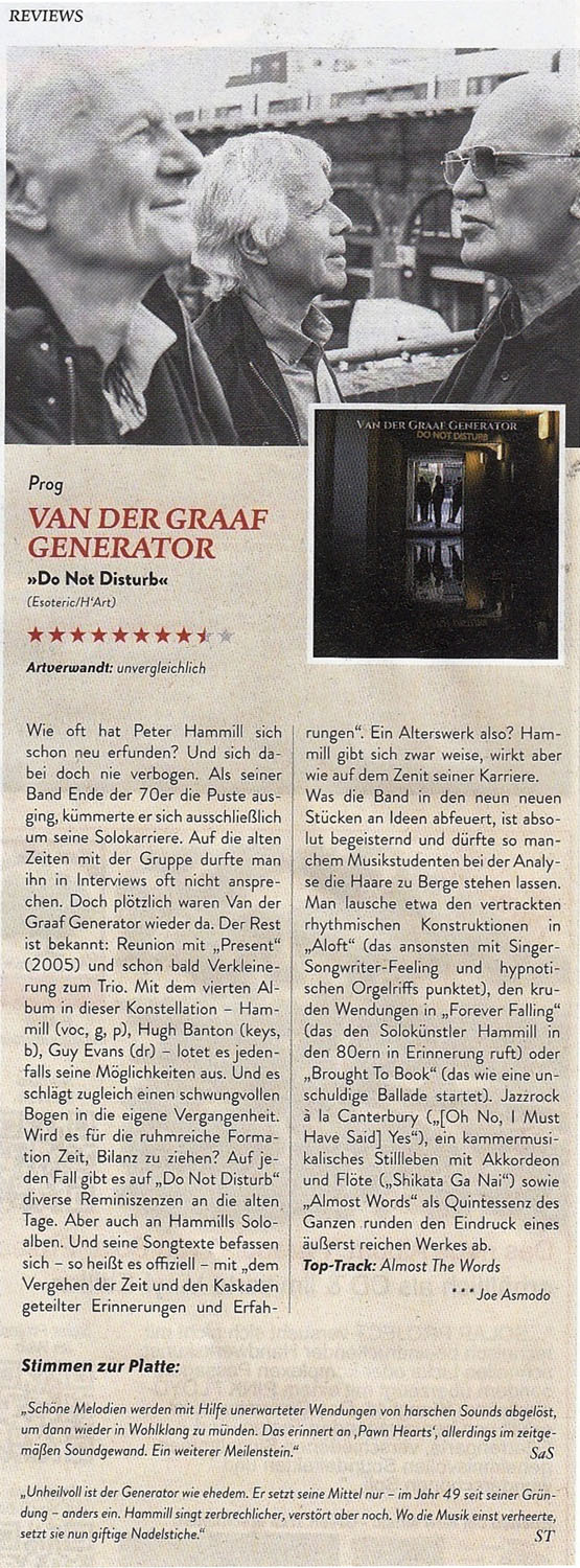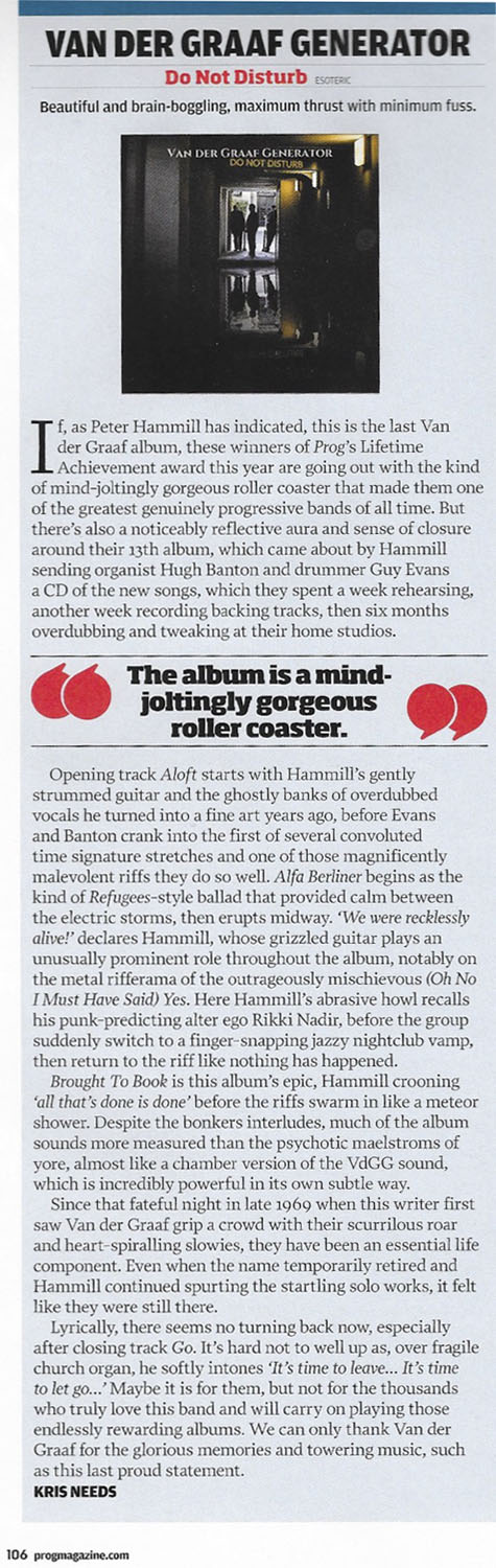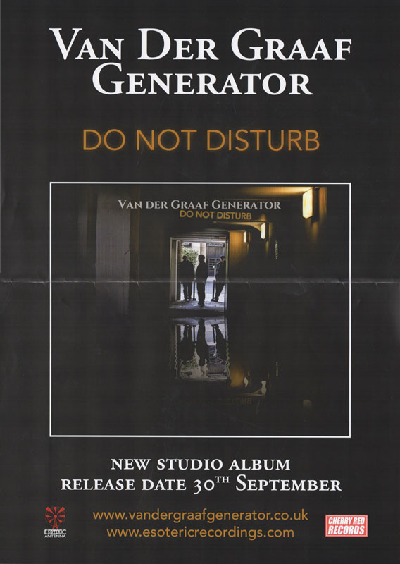 Review by Jim Christopulos: There's a discernible upward trajectory to the main Van der Graaf Generator releases since their '05 reformation. Present was the "they're back!!!" album which was pretty solid and received unanimous acclaim in the press, but any minor shortcomings were probably overlooked because it was thrilling to live in a world where "they're back!!!" Trisector was the debut of the trio (Jaxon having split at the end of '05) and further confirmation that 21st Century VdGG was in no danger of tarnishing the vaunted legacy but would instead add to it, quite exquisitely. Yet, for the great songwriting and performances, there was a feeling that the trio was gaining its footing and that a classic was just within its reach. That promised potential was realized with A Grounding In Numbers, a tremendously strong album with real bite and one that, to my mind, can stand proudly and rightly with any of the much-loved 70s output. Which brings us to Do Not Disturb. Incredibly, the new (and possibly final) offering from Van der Graaf Generator is the best thing they've done since their reformation. In a career that has origins dating back almost fifty years, this album feels like the culmination of their noble journey, as if this was meant to be the closer. As such, Do Not Disturb sometimes recalls past glories yet sounds new, groundbreaking, and unlike anything else they've done. I hope loads of newbies come across it because at least some of them (the ones that don't run screaming from the room, as ever) will have a "Where have they been all my life" moment and work their way backward, and good for them. As for long time fans, they will not be disappointed although they may be caught off guard and challenged. Van der Graaf Generator have not stated that this will be the last album, and there certainly may be further releases. However, given their age (all members in their mid-Sixties), they are aware that it could be the last VdGG release and that thought was stated and swirling about as they made the record. Perhaps because of this, there is more stylistic variance on this disc than on any other VdGG release (and that includes World Record with its reggae and flamenco flourishes...). Actually, there is probably more variance in any one song on this album than there is on any previous disc. That's obviously a bit of an exaggeration but, seriously, just when you think you have a grip on where it's all going, it twists into a completely unpredictable direction, often several times within the same song. The risk is that this approach can leave the unprepared so befuddled that accusations of throwing in everything and the kitchen sink may arise. But there is, paradoxically, a twisted cohesion to the proceedings thanks to VdGG's expert execution. They make it work. And it's fantastic. The album opens with "Aloft". Its breezy guitar, gentle vocals, and the delicate cymbal work of Guy Evans evoke the opening tune of AGIN, "Your Time Starts Now". Not for long, however, as the song shifts to a jabbing, organ-led workout which morphs yet again into a powerful, heavy electric guitar romp, and back again. A real belter of an opener, revealing textures hitherto unheard on any past offerings as accordion is added to the VdGG palette. In the capable hands of Hugh Banton, that's a major plus point (think Astor Piazzolla, not "Roll Out The Barrel"). There are odd time signatures and some complicated playing but the band make it sound smooth and effortless. Then it's back to Italy, 1972, and VdGG being driven around by promoter Maurizio Salvadori in his "Alfa Berlina". In a reference to that era, the song starts out with a somewhat avant-garde sound collage containing audience applause (presumably from an Italian audience), sirens, and street traffic before launching into a driving 4/4 number with an infectious chorus. This tune could almost be a hit, so catchy is it, although I don't know how radio would feel about the soundscape sections (I love 'em). "Room 1210" is, lyrically, about the solace one takes in the sanctuary of a hotel room, which is certainly a welcome respite from the chaos surrounding touring musicians much of the time. Guy's light touch on the cymbals and HB's accordion work stand out. Similar to "Almost The Words" and "Brought To Book", it's a piano-based song which affirms that, while the band may be known as merchants of hair-raising chaos, they are also expertly capable of delivering up wistful moments of beauty. In the case of the latter two songs, it's some of the most accessibly elegant music they've ever produced. All three numbers share another similarity, which is that they all go off into completely different directions after a seemingly unshakable, tranquil mood is set. And I mean seriously different directions. And they're album highlights in my book. In "Almost The Words", the wistful piano section gives way to a glorious rock workout which gives Banton the opportunity to demolish his gear with a blistering solo. It's reminiscent in style and tone of his solo spot in "Octopus" from the late 60s debut album Aerosol Grey Machine. Great stuff! In the case of "Brought To Book", I honestly can't even describe what I heard. Really. The beauteous piano music just stops and goes into this absurdist Dada-like jam that is probably the biggest "WTF just happened???" moment on any VdGG album, ever. It's AWESOME! Just about every tune is a standout. "Shikata Ga Nai" is ethereal, evocative, moody... it could well be Banton's modern take on "Pictures / Lighthouse" from Pawn Hearts, except on accordion. At the same time, there's nothing like it in the VdGG catalog and it's stunning. The rockers this time around are "Forever Falling" and "(Oh No, I Must Have Said) Yes". The former starts out like "The Hurley Burley" (with lyrics) before giving way to an off-time signature groove complete with electric guitar, stabbing organ chords, and tasteful percussion (shakers and the like) augment