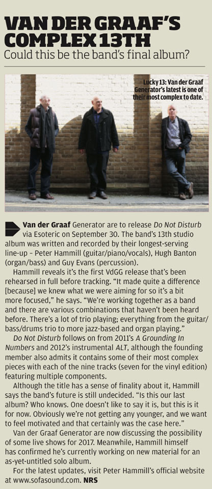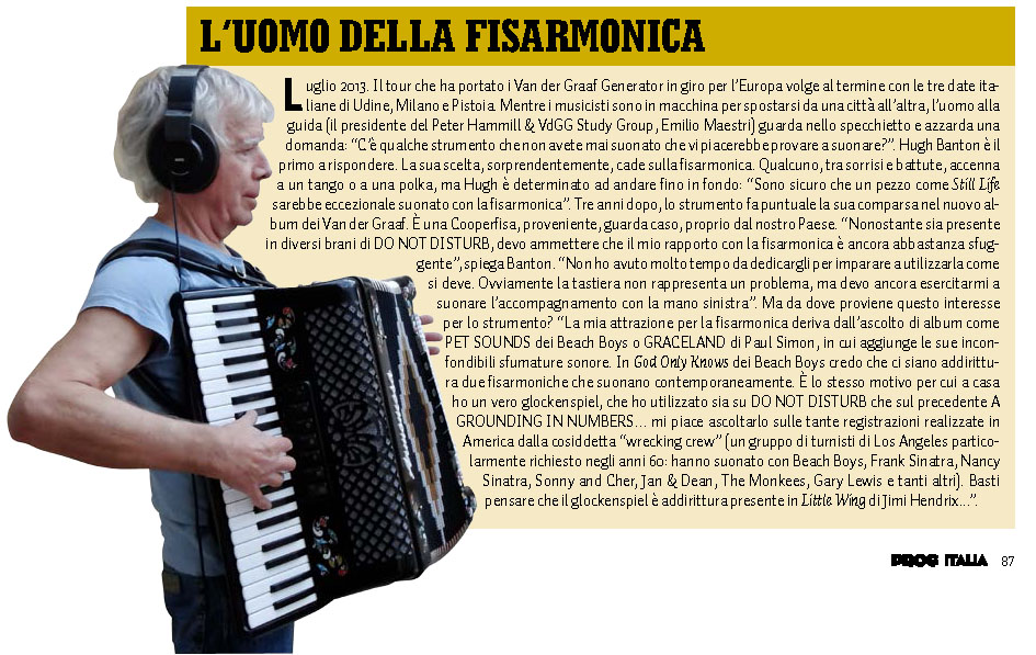 | July 2013. The tour that brought Van der Graaf Generator around Europe draws to a close with the three Italian dates of Udine, Milan and Pistoia. While the musicians are in the car moving from city to city, the guide (the president of the Peter Hammill & VdGG Study Group, Emilio Maestri) looks in the mirror and asks a question: "Is there any instrument that you have never played that you would like to try playing?". Hugh Banton is the first to respond. His choice, surprisingly, falls on the accordion. Someone, between smiles and jokes, mentions a tango or a polka, but Hugh is determined to go all the way: "I am sure that a piece like Still Life would be exceptional played with the accordion." Three years later, it makes a timely appearance on the new Van der Graaf album. It is a Cooperfisa, coming, as it happens, right from our country (Italy). "Although it appears in several passages on DO NOT DISTURB, I must admit that my relationship with the accordion is still quite elusive." Banton said. "I did not have much time to learn how to use it. Of course, the keyboard is not a problem, but I still had to practice the bass part with the left hand. "But where does this interest for the instrument come from? "My attraction for the accordion comes from listening to albums like PET SOUNDS by the Beach Boys or GRACELAND by Paul Simon, in which he adds his unmistakable sound nuances. In "God Only Knows" by the Beach Boys, I think there are even two accordions playing at once. It's the same reason why at home I have a real glockenspiel, I've used both on DO NOT DISTURB, more than on the previous A GROUNDING IN NUMBERS... I like to hear the many recordings made in America by the so-called "wrecking crew" (a group of LA session aces particularly requested in the 60s: they played with the Beach Boys, Frank Sinatra, Nancy Sinatra, Sonny and Cher, Jan and Dean, The Monkees, Gary Lewis and many others). I think that the glockenspiel is even present in "Little Wing" by Jimi Hendrix...". (Thanks to Paolo Carnelli for the piece) |