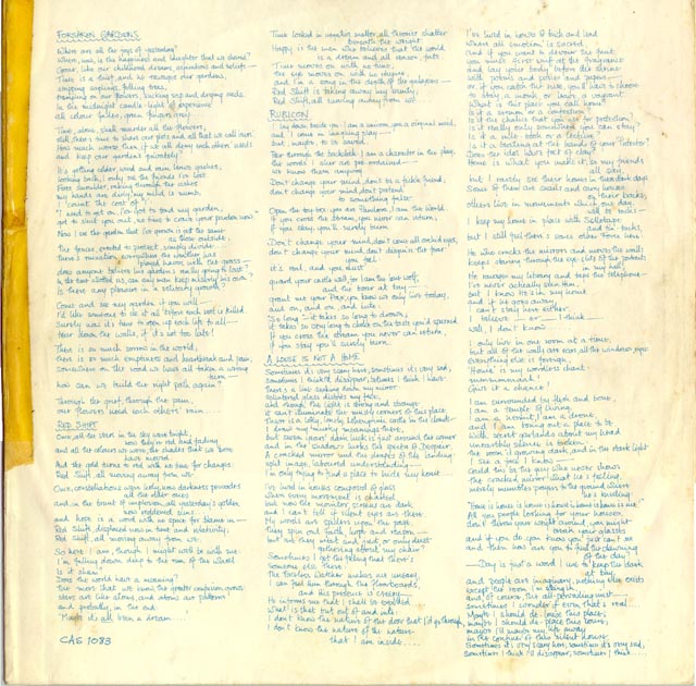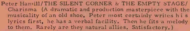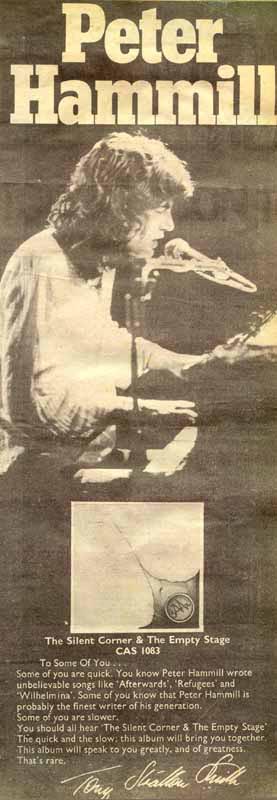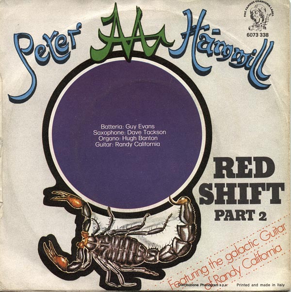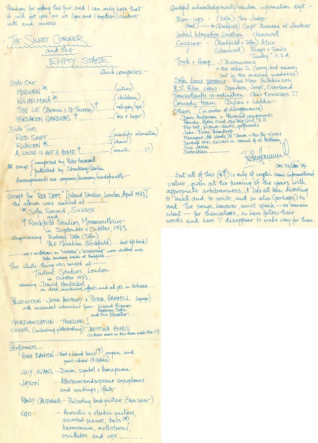 The album came with an inner sleeve printed upon which were the lyrics to the songs in Peter Hammill's own hand. It starts "Thankyou for getting this far, and I can only hope that it will get you as we (you and I together) venture into and across ..... The Silent Corner and the Empty Stage....which comprises.." etc... The album featured Hugh, Guy and Jaxon, along with Randy California playing lead guitar on Red Shift.